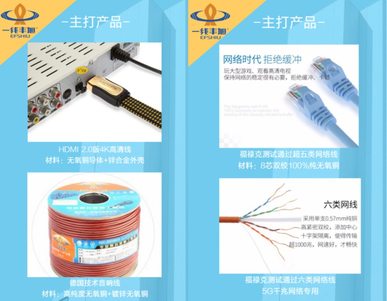 一線豐旭以工匠精神為核心精神,以堅持創(chuàng)新為企業(yè)發(fā)展動力,研發(fā)制造了如一線豐旭超五類、六類網(wǎng)絡線,一線豐旭德國技術音響線,一線豐旭高清HDMI線2.0等一系列在市場獲得不俗反響的產(chǎn)品。