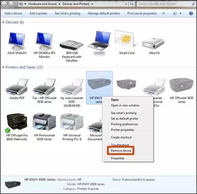 斷開(kāi)電腦上的打印機(jī) USB 連接線。在驅(qū)動(dòng)程序安裝過(guò)程中如果未出現(xiàn)提示,請(qǐng)勿重新連接連接線。 在 Windows 中搜索“設(shè)備”,然后在結(jié)果列表中點(diǎn)擊設(shè)備和打印機(jī)控制面板設(shè)置。 右擊打印機(jī)型號(hào)圖標(biāo),然后點(diǎn)擊“移除設(shè)備”。如果顯示多個(gè)打印機(jī)圖標(biāo),請(qǐng)全部移除。 圖片 : 從“設(shè)備和打印機(jī)”中移除打印機(jī)