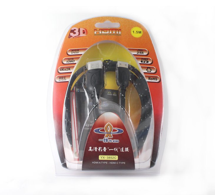 | 名稱:HDMI/A公-HDMI/C公 數(shù)字高清線 型號(hào):YX-3852C 顏色:啞面黑+黑白棉網(wǎng) 長度:1.5米 包裝:吸塑 尺寸:140*25.5*190mm 包裝專利號(hào):ZL 2010 3 0286480.5 環(huán)保:符合ROHS標(biāo)準(zhǔn) 產(chǎn)地:廣東深圳 結(jié)構(gòu):標(biāo)準(zhǔn)1.4版本32AWG線規(guī),主線5組*3芯+4芯和1芯編織=19+1標(biāo)準(zhǔn)支數(shù) |