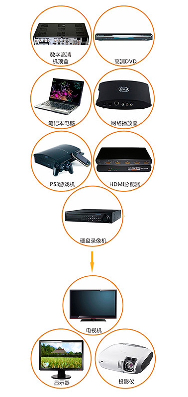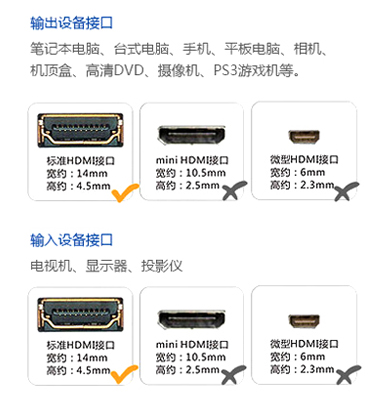 | HDMI高清線接法 將線材的一端HDMI/C端子插入數(shù)碼相機(jī)和手機(jī)等輸出設(shè)備對(duì)應(yīng)接口,另一端HDMI/公端子插入筆記本電腦、PC電視機(jī)和顯示器等輸入設(shè)備的對(duì)應(yīng)插座即可。 |