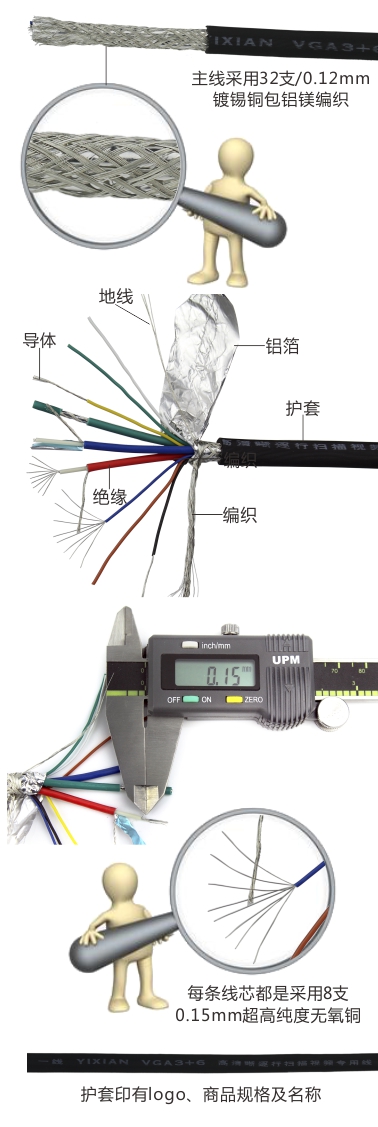 VGA3+6視頻線編織 2、銅絲直徑0.1mm,單邊銅絲足128支 3、光亮、平滑無銹斑 編織加鋁箔完全杜絕外界強(qiáng)電磁干擾,圖像傳輸清晰逼真