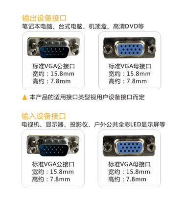 | VGA3+9視頻線接法 將VGA逐行掃描視頻連接線VGA端子插入臺(tái)式電腦主機(jī)、筆記本、DVD、播放器等輸出設(shè)備,另一端插入顯示器、液晶電視機(jī)、電視機(jī)、投影儀、戶外公共全彩LED顯示屏設(shè)備等。 |
