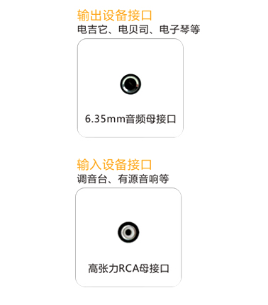| 電吉他音頻線接口 1、標準RCA和6.35mm端子接口 2、接駁方便,撥插力度適中 |