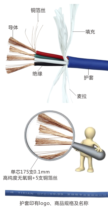 發(fā)燒音箱線導體 1、采用175支超高純度無氧銅 2、銅絲直徑0.1MM+5支銅箔絲=單條芯線足1.5平方 3、光亮、平滑無銹斑 抗氧化強,高保真幾何原理設計