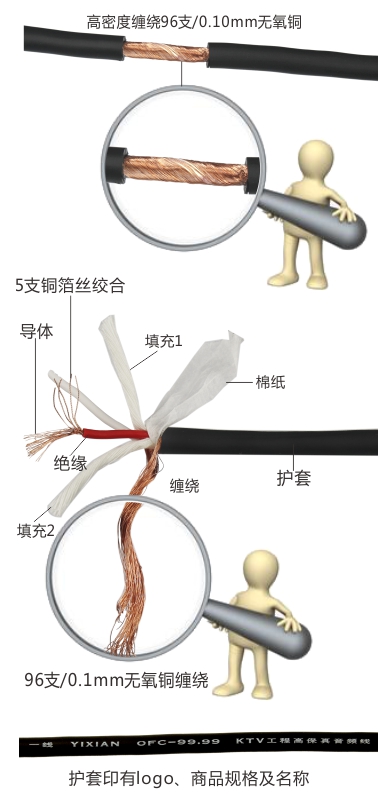 產(chǎn)品:2芯各加5支銅箔絲絞合+2束細(xì)棉紗+棉紙+高密度纏繞=高保真結(jié)構(gòu)設(shè)計并制造有效提升音質(zhì)并使音頻信號達(dá)到最佳效果 導(dǎo)體:抗氧化強(qiáng),降低衰減和損耗 絕緣:雙絞線,增強(qiáng)音頻信號傳輸 填充:加強(qiáng)抗拉強(qiáng)度使線材圓潤 棉紙:易剝皮并增強(qiáng)線材柔軟度 纏繞:杜絕外界強(qiáng)電磁干擾,聲音傳輸清晰不失真并增強(qiáng)線材柔軟度 護(hù)套:優(yōu)質(zhì)高彈性PVC原料耐油耐磨耐酸堿增長使用壽命達(dá)15年以上 噴米:保證100%足米