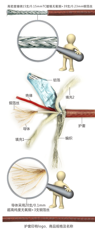 產(chǎn)品:2芯各分28支+4支銅箔絲絞合+2束細棉紗+鋁箔+高密度編織=高保真結構設計并制造有效提升音質(zhì)并使音頻信號達到最佳效果 導體:抗氧化強,降低衰減和損耗 絕緣:雙絞線,增強音頻信號傳輸 填充:加強抗拉強度使線材圓潤 鋁箔:增強屏蔽信號,杜絕外界強電磁干擾 編織:編織加鋁箔完全杜絕外界強電磁干擾,聲音傳輸清晰不失真 護套:優(yōu)質(zhì)高彈性PVC原料耐油耐磨耐酸堿增長使用壽命達15年以上 噴米:保證100%足米