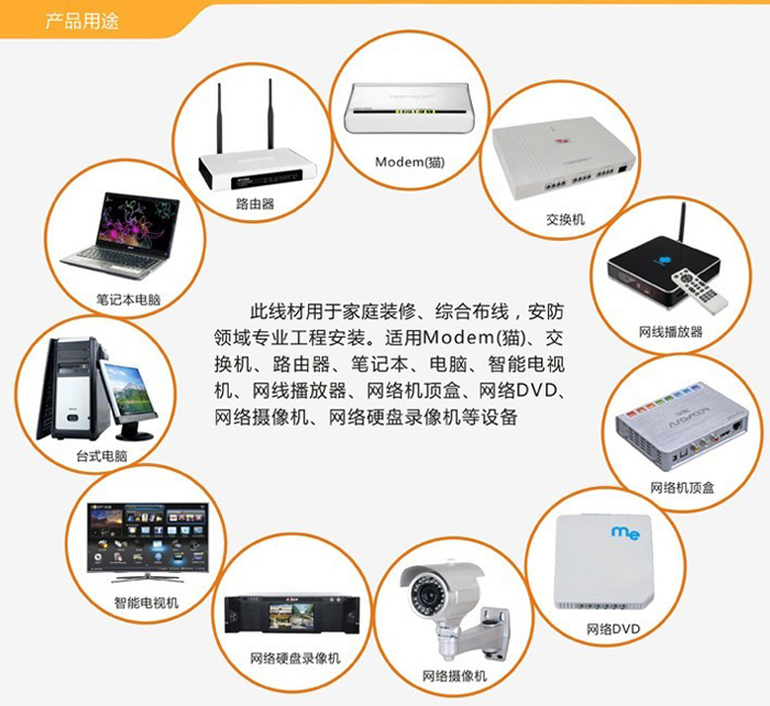 網(wǎng)絡(luò)線廣泛適用于家庭裝修、綜合布線,安防領(lǐng)域?qū)I(yè)工程安裝。適用Modem(貓)、交換機(jī)、路由器、筆記本、電腦、智能電視機(jī)、網(wǎng)線播放器、網(wǎng)絡(luò)機(jī)頂盒、網(wǎng)絡(luò)DVD、網(wǎng)絡(luò)攝像機(jī)、網(wǎng)絡(luò)硬盤錄像機(jī)等設(shè)備等